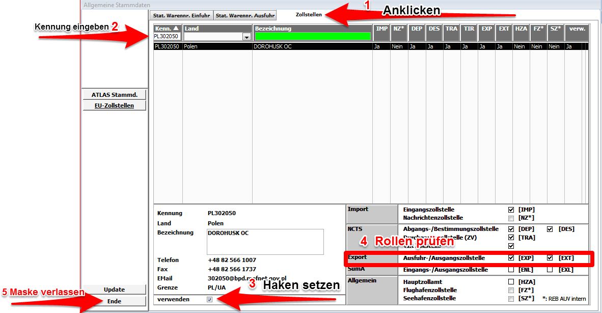 Anschließend kontrollieren Sie bitte ob die Zollstelle die richtige Rolle hat.